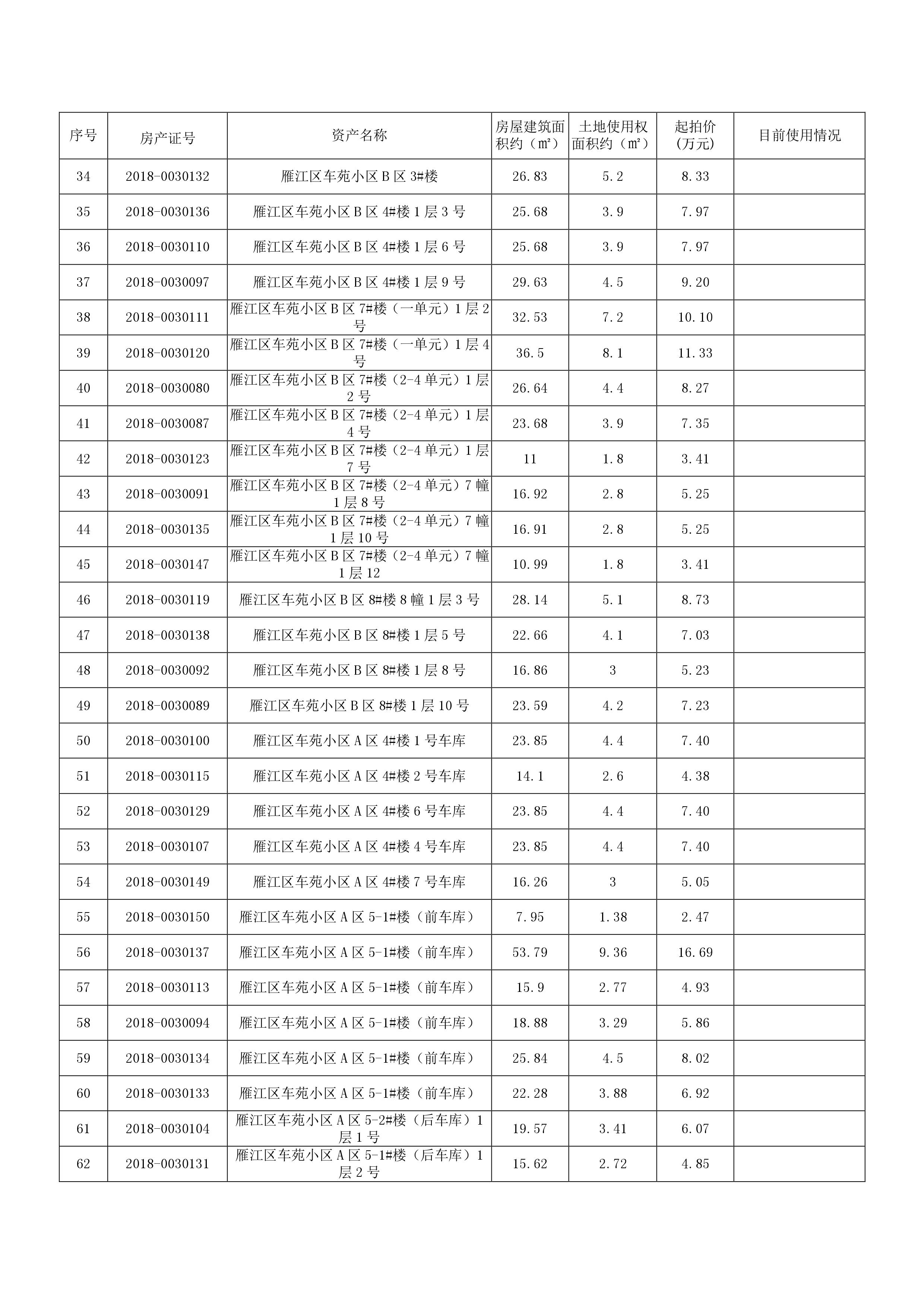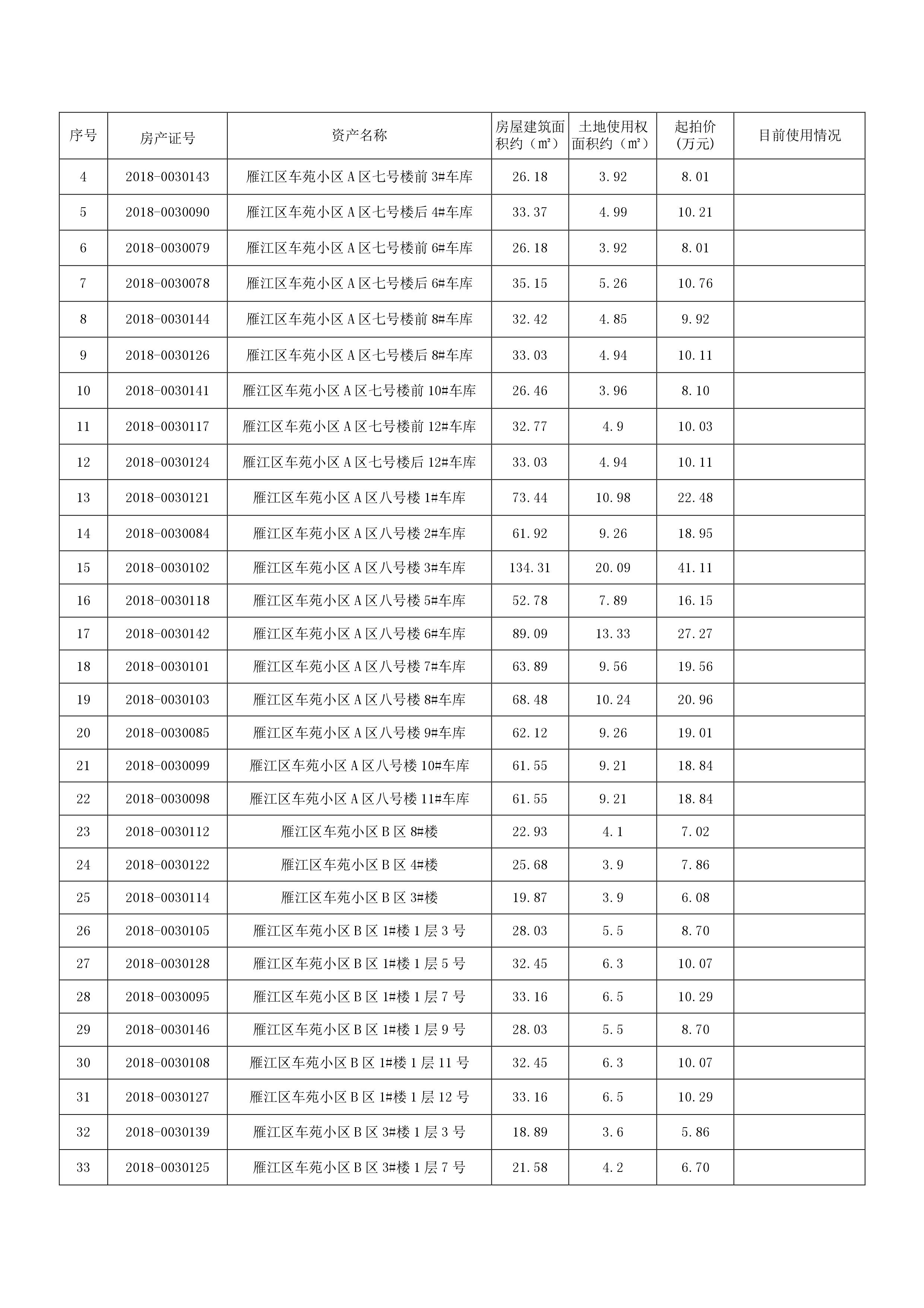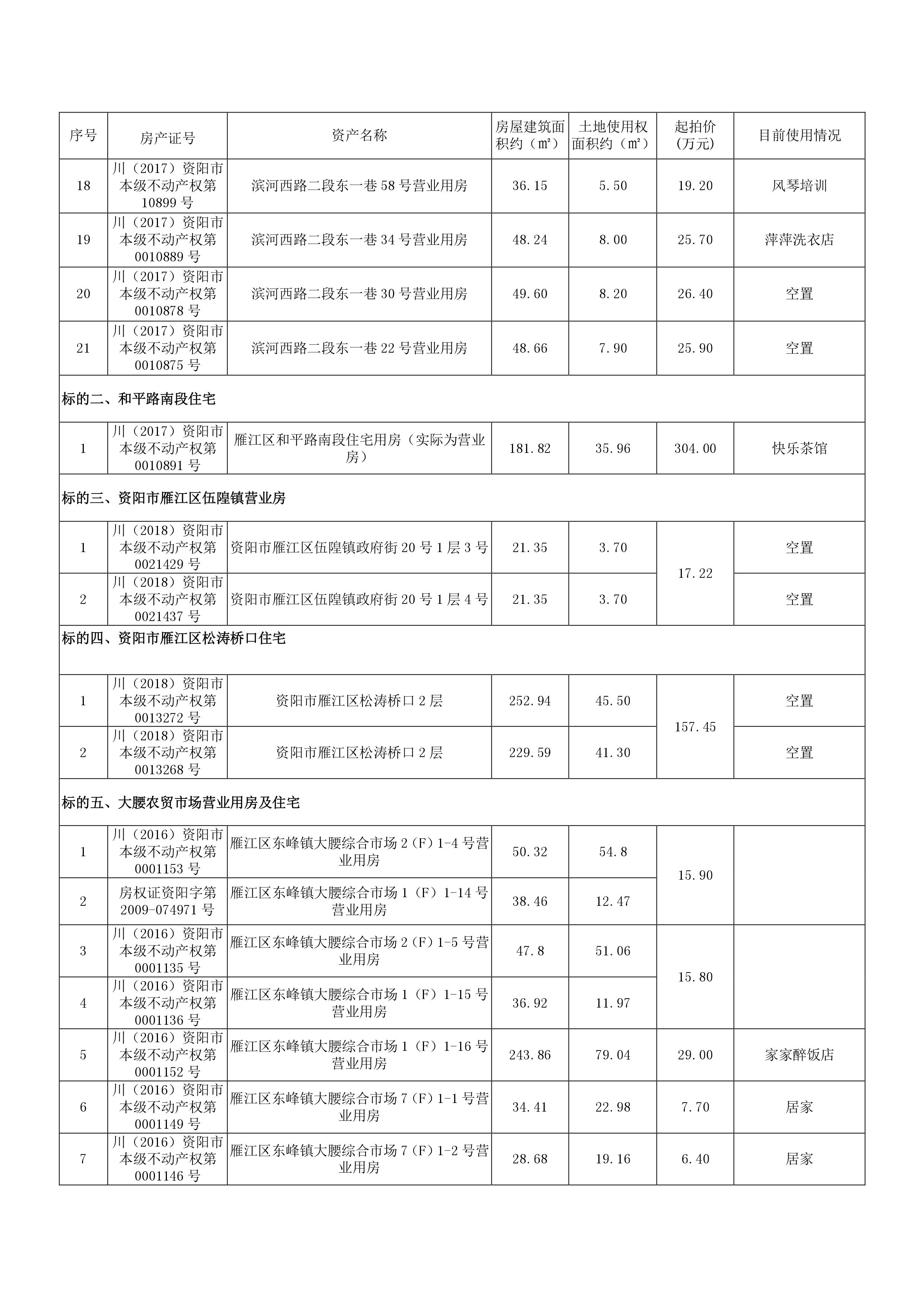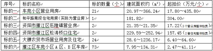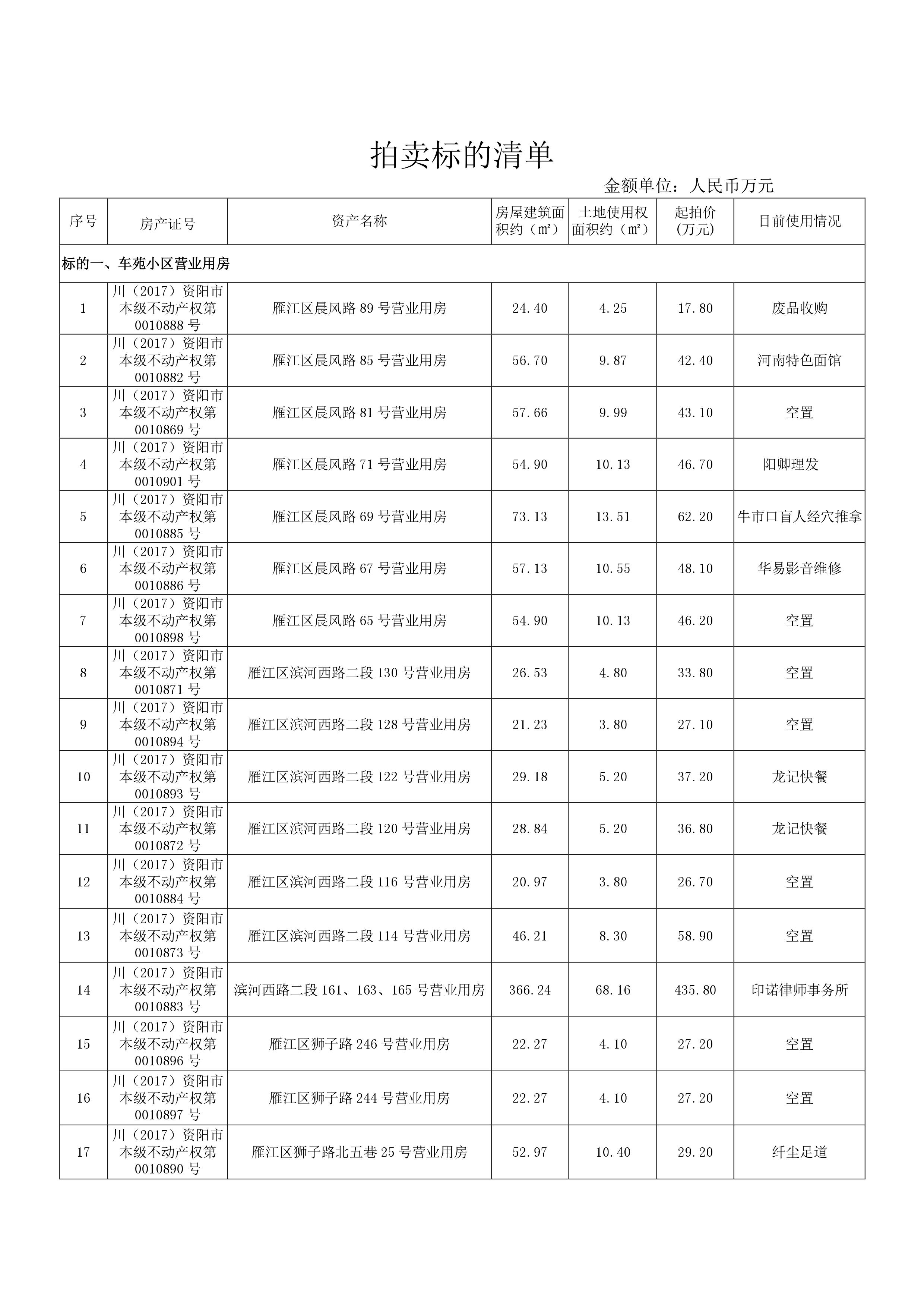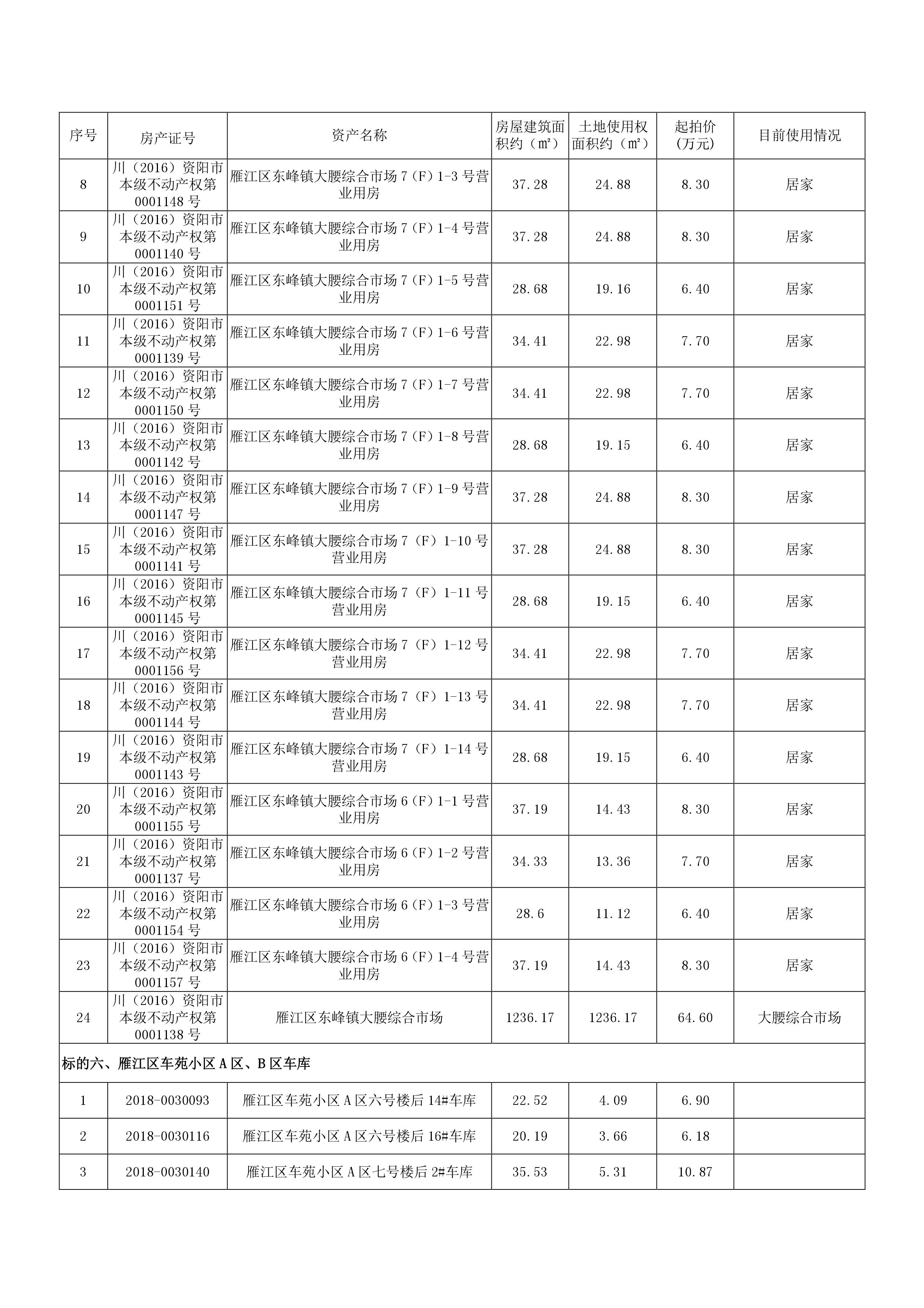 二、競(jìng)買資格:標(biāo)的一、二、三、四、五中的各標(biāo)的:中華人民共和國(guó)境內(nèi)外的法人、自然人和其他組織除法律另有規(guī)定外均可申請(qǐng)參加競(jìng)買;標(biāo)的六的各標(biāo)的:僅限雁江區(qū)車苑小區(qū)的業(yè)主本人(單位)競(jìng)買。