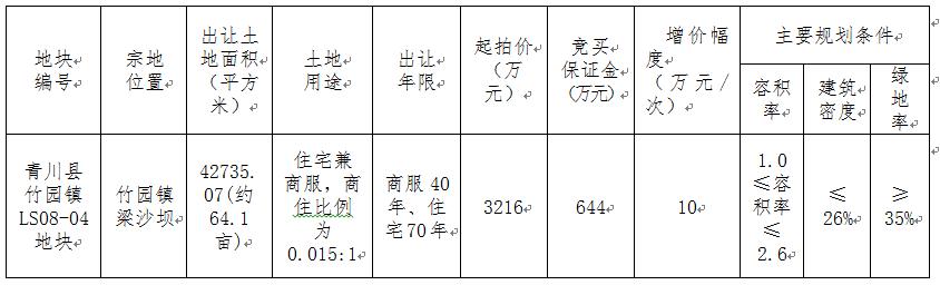 五、本次拍賣出讓的詳細資料和具體要求,詳見拍賣出讓文件。申請人可于2019年5月13日至2019年 6月3日,到青川縣自然資源局獲取拍賣出讓文件。