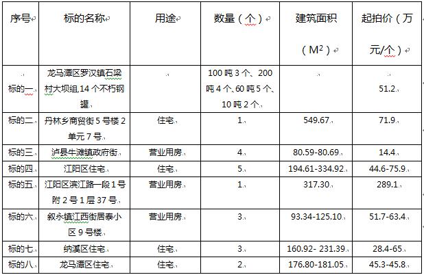 受委托,我公司將于2019年6月14日14:30在瀘州市江陽區江陽西路43號樓12樓會議室拍賣下列標的,現將拍賣相關事宜公告如下:
