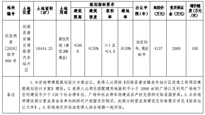 四、本次拍賣出讓的詳細(xì)資料和具體要求,詳見拍賣出讓文件。申請(qǐng)人可于2020年11月14日至2020年12月3日到 劍閣縣土地礦權(quán)收購儲(chǔ)備交易中心(劍閣縣下寺鎮(zhèn)劍門關(guān)大道北段257號(hào))獲取拍賣出讓文件。