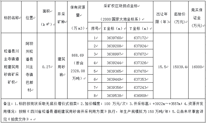經松潘縣人民政府批準,受松潘縣自然資源局委托,定于2024年3月15日10:00在阿壩州公共資源交易中心四樓產權交易大廳(汶川縣威州鎮東街246號),對松潘縣川主寺鎮道班建筑用砂巖礦采礦權出讓依法進行公開拍賣,現將有關事項公告如下: