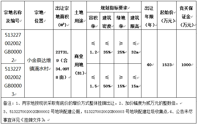 經(jīng)小金縣人民政府批準,受小金縣自然資源局委托,對小金縣達維鎮(zhèn)滴水村“513227002002GB00002”號、“513227002002GB00003”號(木爾寨溝口)地塊依法進行公開掛牌出讓。現(xiàn)將有關事項公告如下: