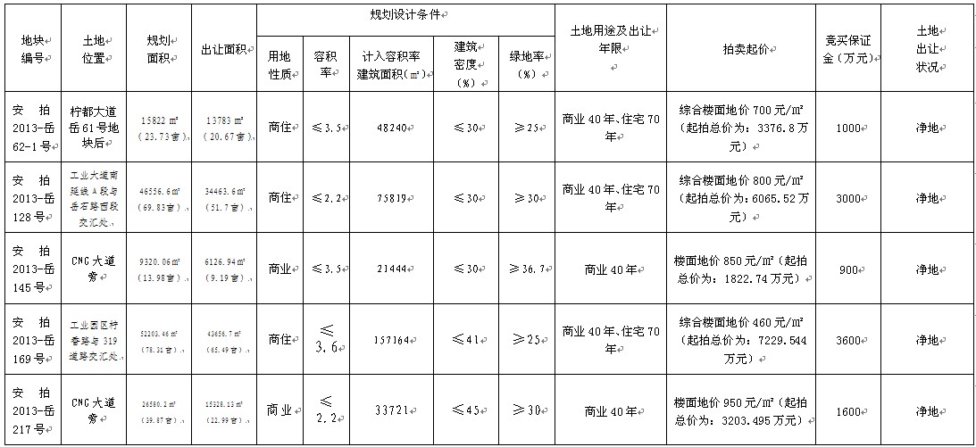 經安岳縣人民政府批準,安岳縣國土資源局決定以拍賣方式出讓安拍2013-岳62-1、128、145、169、217號地塊國有建設用地使用權。現將有關事項公告如下: