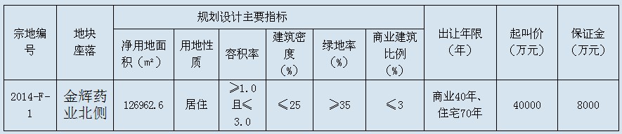 根據(jù)《土地管理法》、《城市房地產(chǎn)管理法》、國土資源部39號令等相關(guān)規(guī)定,經(jīng)資陽市人民政府批準(zhǔn),資陽市國土資源局決定以拍賣方式出讓沱東新區(qū)金輝藥業(yè)北側(cè)(編號:2014-F-1號)地塊國有建設(shè)用地使用權(quán)。
